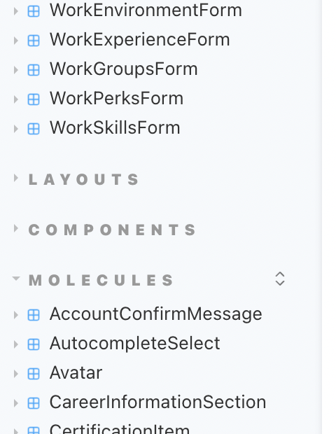 Atoms: Are usually made with only one single HTML element. (Examples: Atoms, Alert, Badge, Button, Dropdown, ErrorMessage, Fieldset, Heading, Icon, InputLabel, InputRange, InputText, Legend, Link, List, Logo, ScrollableArea, SidekickCard, Spinner, Text, Trustpilot)