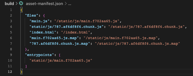 Next, replace “ENTRY_POINT_FILE_NAME” with your generated entrypoint file name. Search through the the assets-manifest.json file for “main.js”, and you’ll find it there.