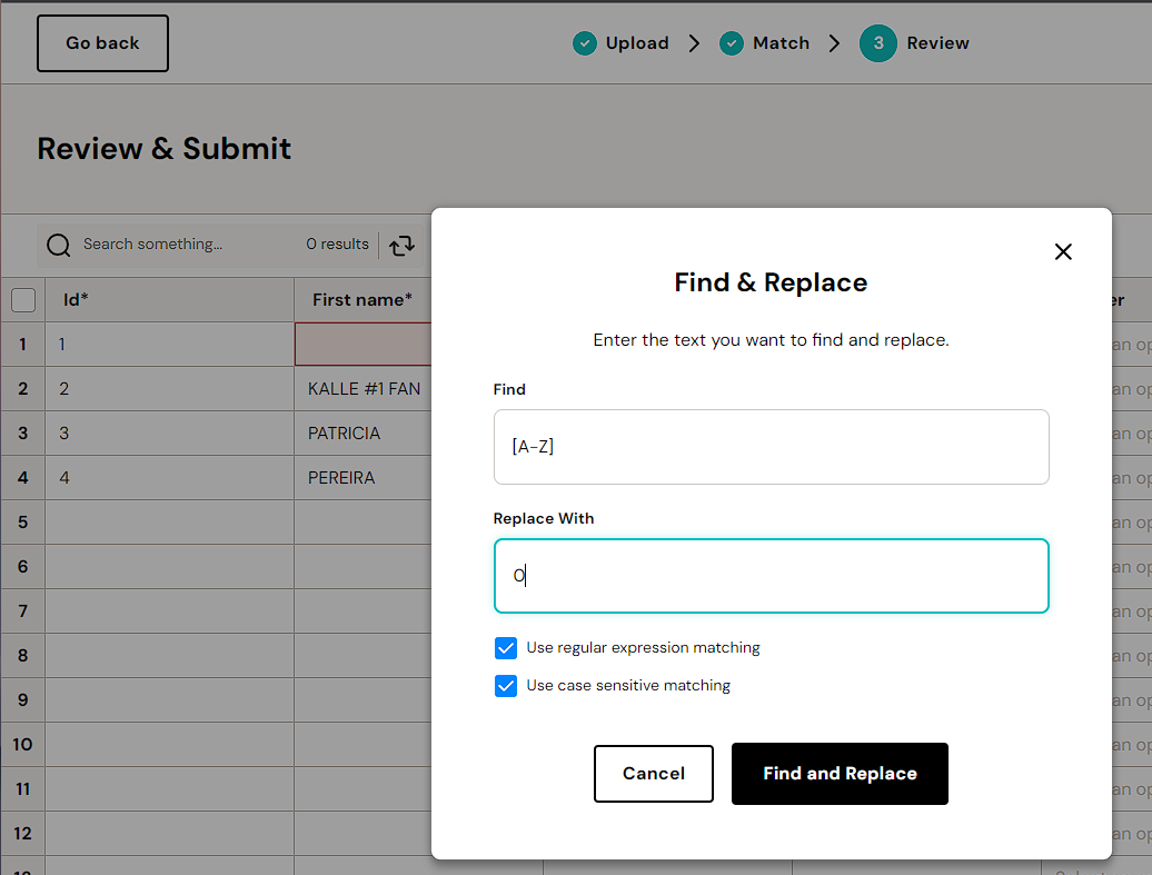 Fuse now empowers you with the flexibility of regular expression matching. Harness the power of patterns to precisely locate and transform data within your CSV files. Whether you need to update specific formats, extract information, or standardize data patterns, our Find and Replace support makes it possible with just a few clicks.