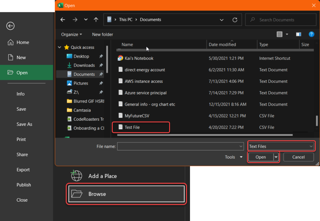 To import your CSV file, the first step is to open Excel. Once in Excel, click File, then select Open, and look for the file you wish to import.
