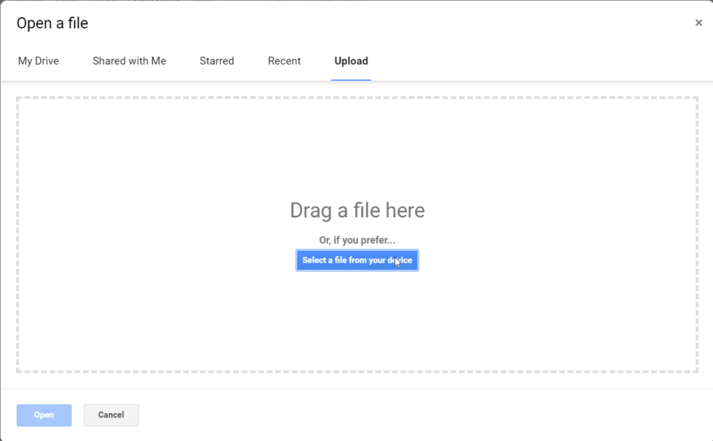 The import option is nearly exactly the same, except you select Import under File. The Open a File menu will open, and you will still select the Upload tab.